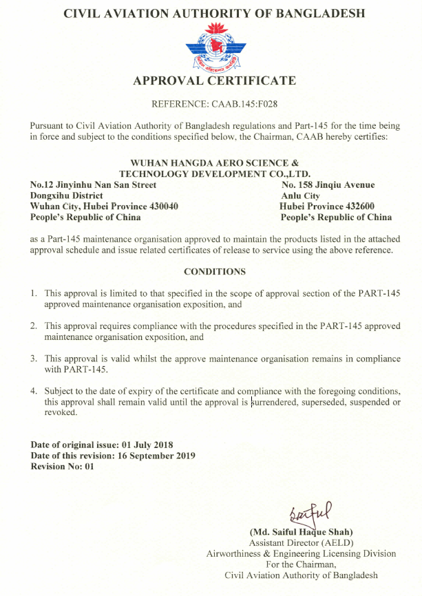 2001年10月 公司獲中國民航總局授權(quán)的民航維修許可證。